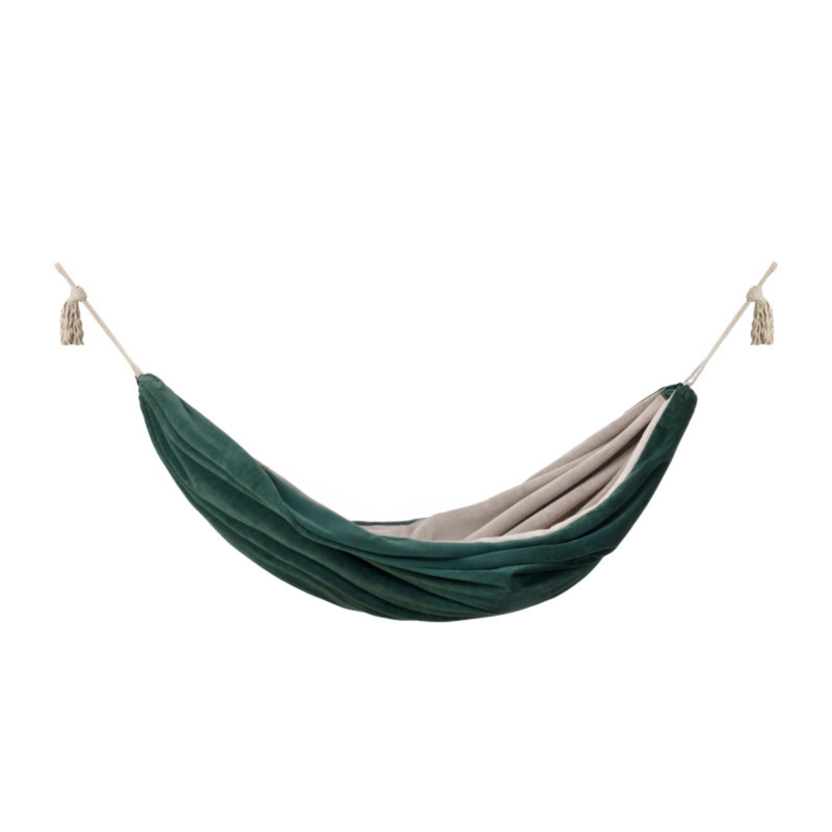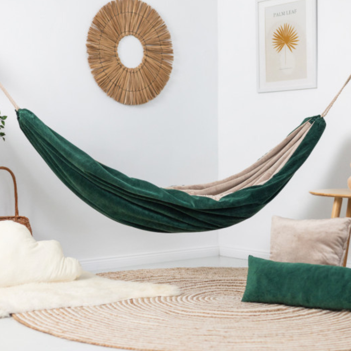 Hamak utrzymany jest w głębokiej zieleni przełamanej beżem – kolorystyce, która uspokaja i doskonale komponuje się z wnętrzami w stylu naturalnym, boho czy skandynawskim. To harmonijny akcent, który wnosi do przestrzeni spokój i elegancję.