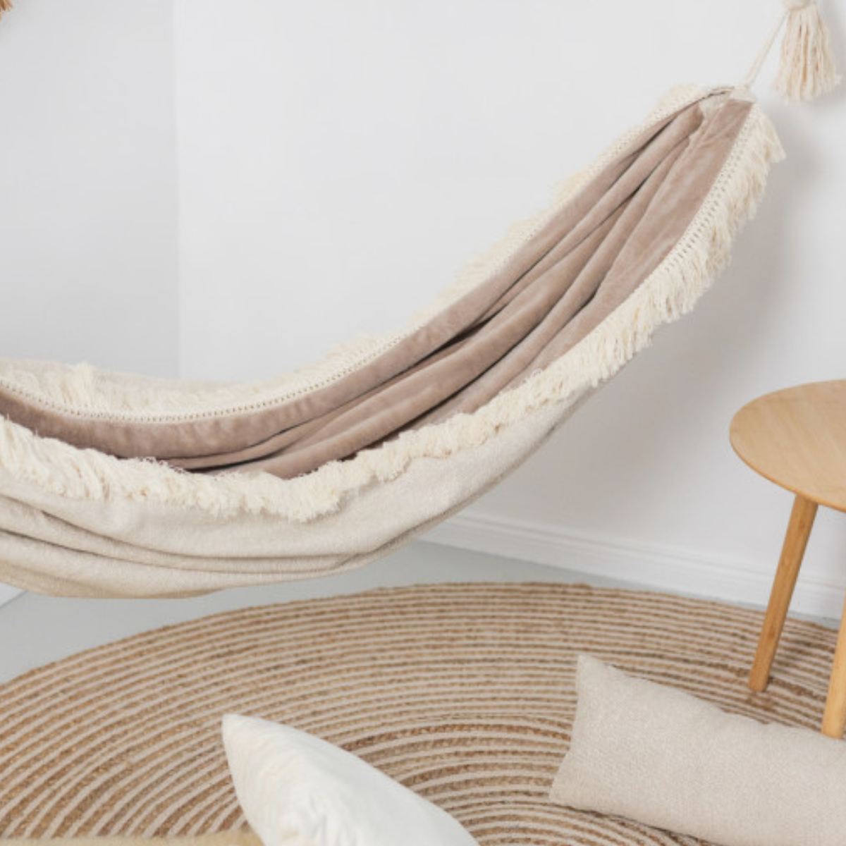 Każdy hamak powstaje w małej polskiej pracowni, z troską o najmniejszy detal. Wykorzystujemy wyłącznie 100% naturalną bawełnę z certyfikatem OEKO-TEX, bezpieczną nawet dla wrażliwej skóry niemowląt. Miękka, aksamitna tkanina i delikatny beżowy kolor doskonale wpisują się w aranżacje dziecięcych wnętrz w stylu boho, skandynawskim czy vintage.