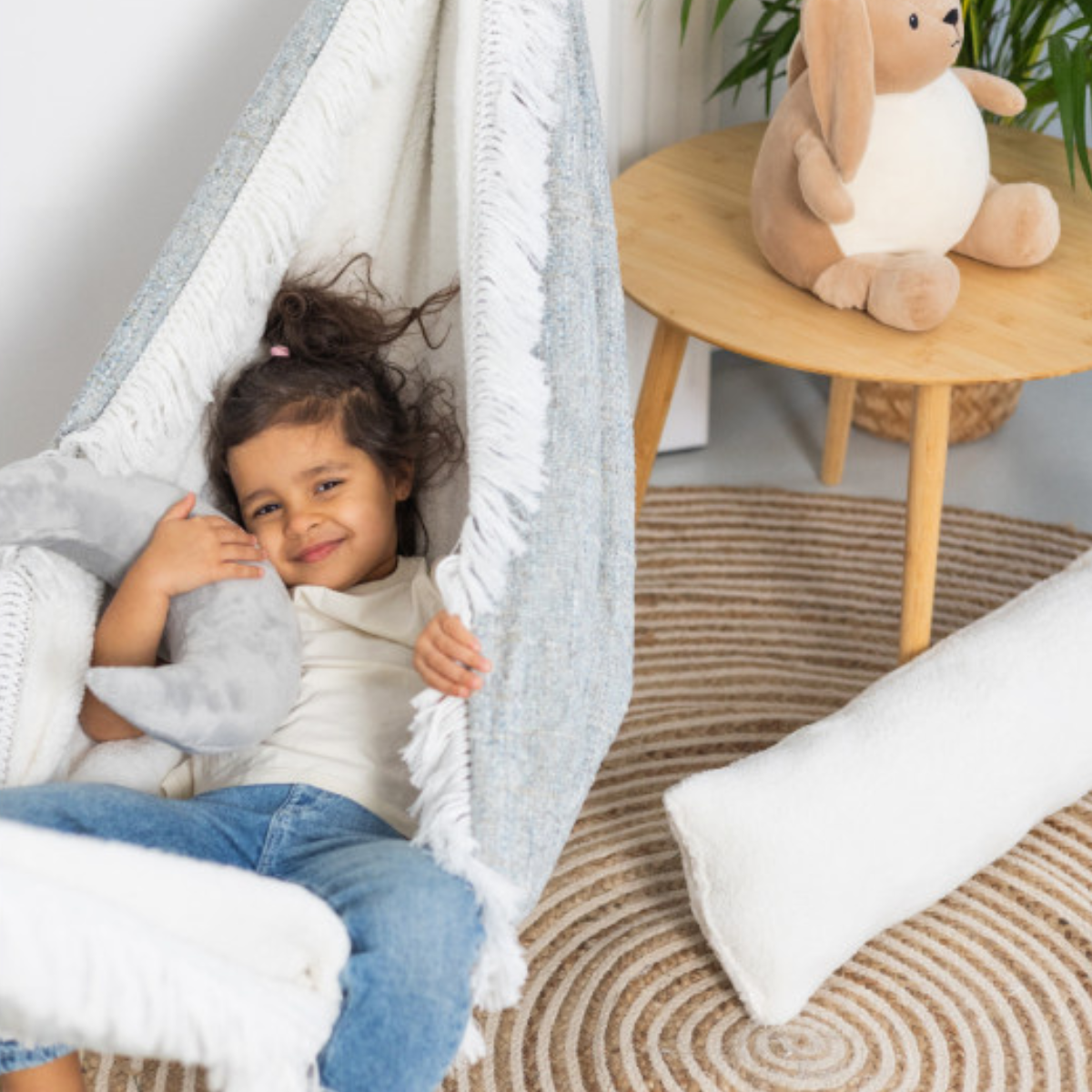 Zawieszony nisko nad ziemią, hamak „Przytulna Krateczka” działa jak miękki fotel – dziecko może do niego samodzielnie wejść, ułożyć się wygodnie i bujać w rytmie marzeń. Sprawdzi się jako miejsce do drzemki, czytania książek, wyciszenia po intensywnym dniu lub po prostu jako bezpieczna i ciepła przestrzeń zabawy. Dzięki neutralnej kolorystyce i przytulnej fakturze idealnie komponuje się z wnętrzami w stylu boho, skandynawskim, klasycznym czy naturalnym.