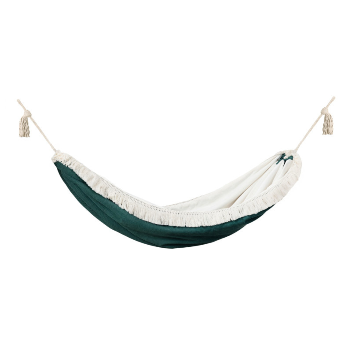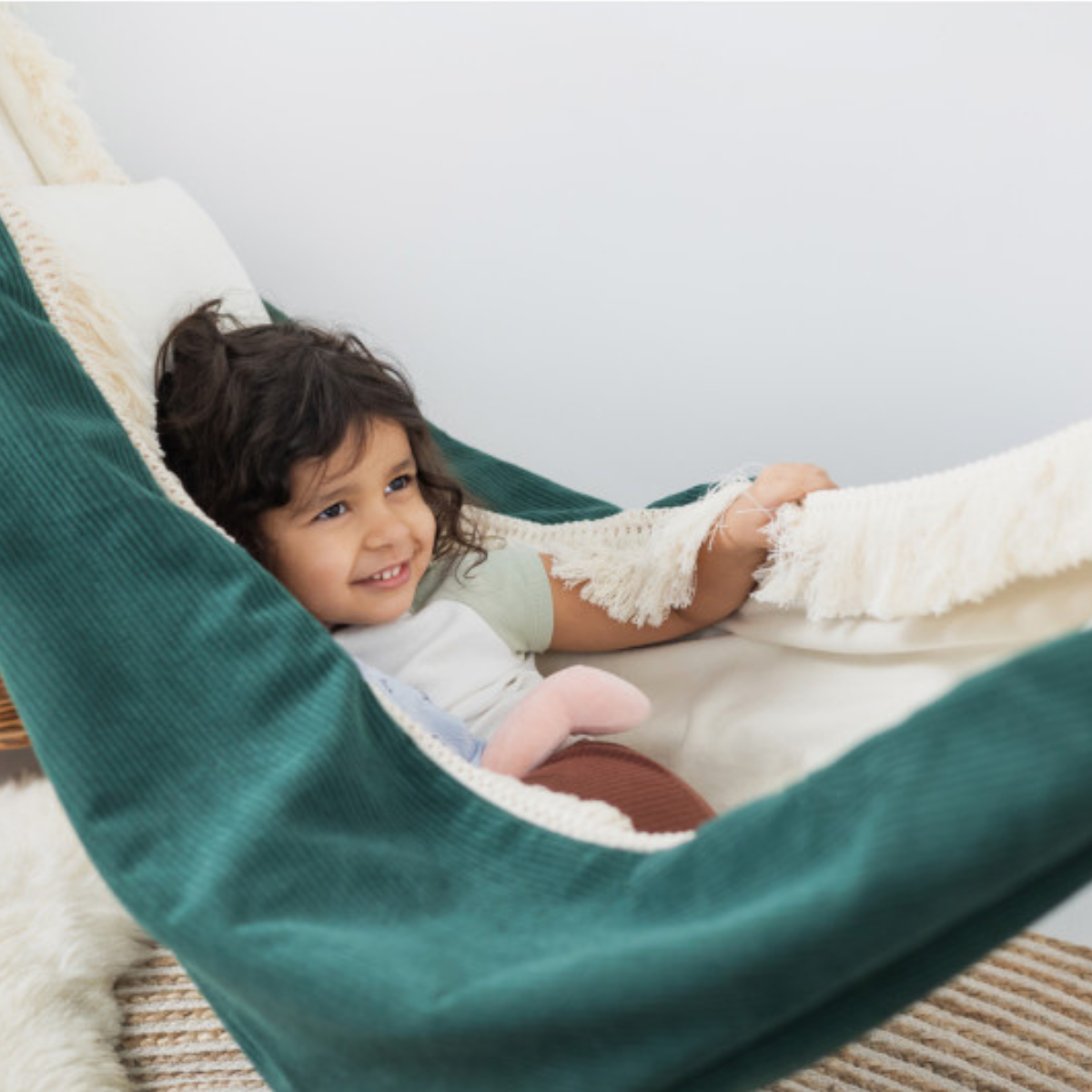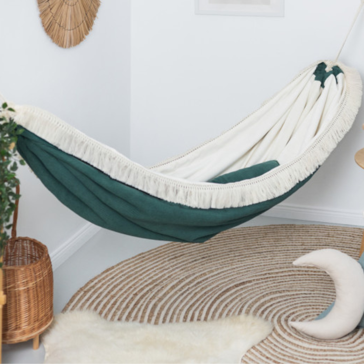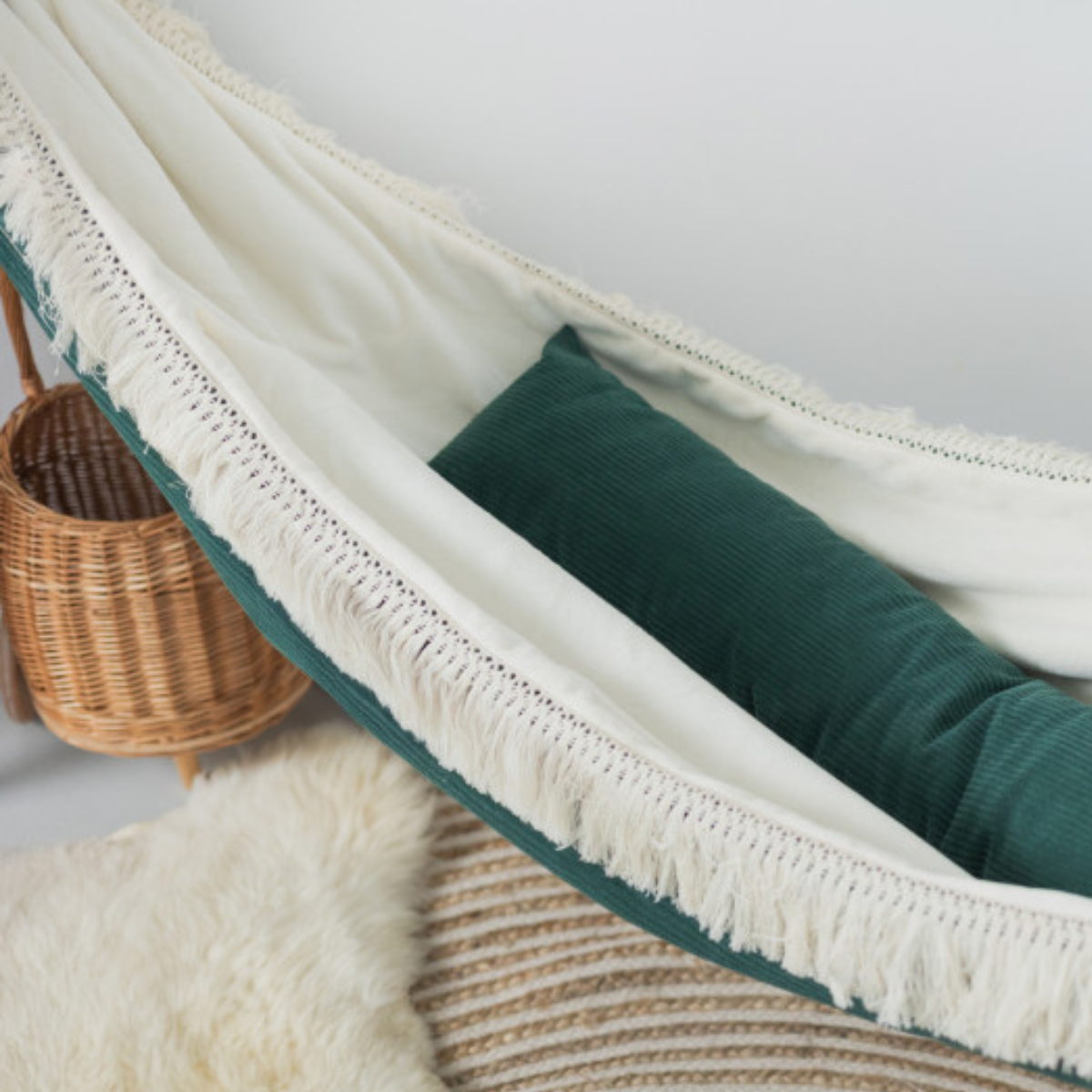 Szmaragdowy hamak to nie tylko komfort – to także dekoracja, która wnosi do wnętrza spokój i klasę. Idealnie komponuje się z pokojami w stylu boho, glamour, naturalnym czy eklektycznym. Delikatne frędzle dodają mu uroku i tekstury – zapraszają do dotyku i zabawy sensorycznej.