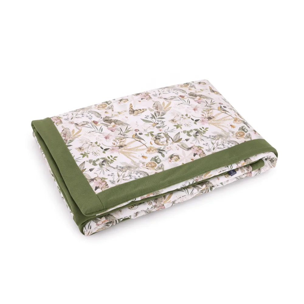 Velvetowy duży koc na jednej stronie ma piękny wzór inspirowany naturą, umieszczony na 100% bawełnianej tkaninie. Jego druga strona jest pokryta mięciutkim Velvetem, który został elegancko przepikowany w unikalny wzór, dodając mu jeszcze więcej klasy i elegancji. Wnętrze koca jest wypełnione lekką, antyalergiczną włókniną silikonową, zapewniającą ciepło nawet w najzimniejsze dni.