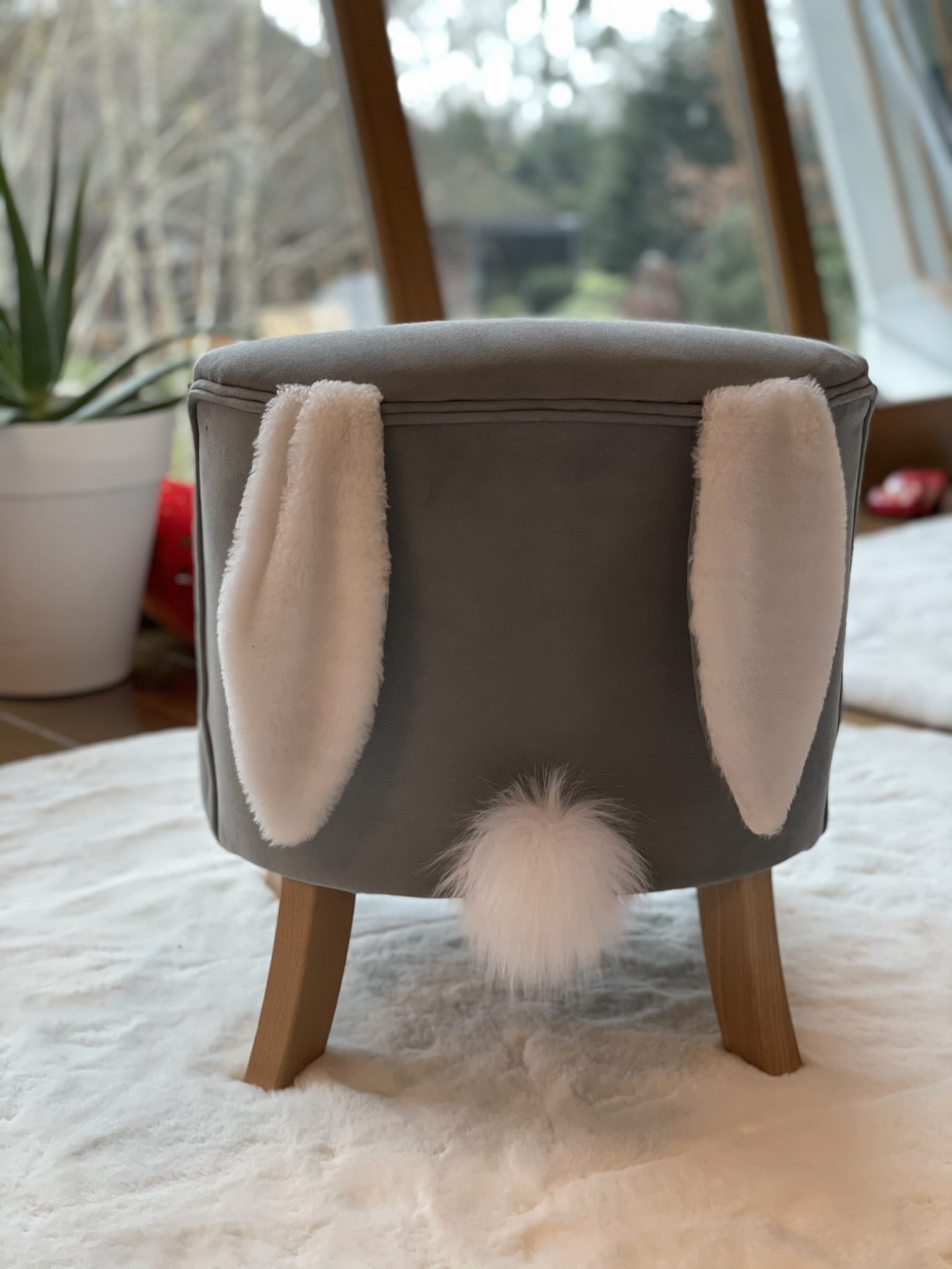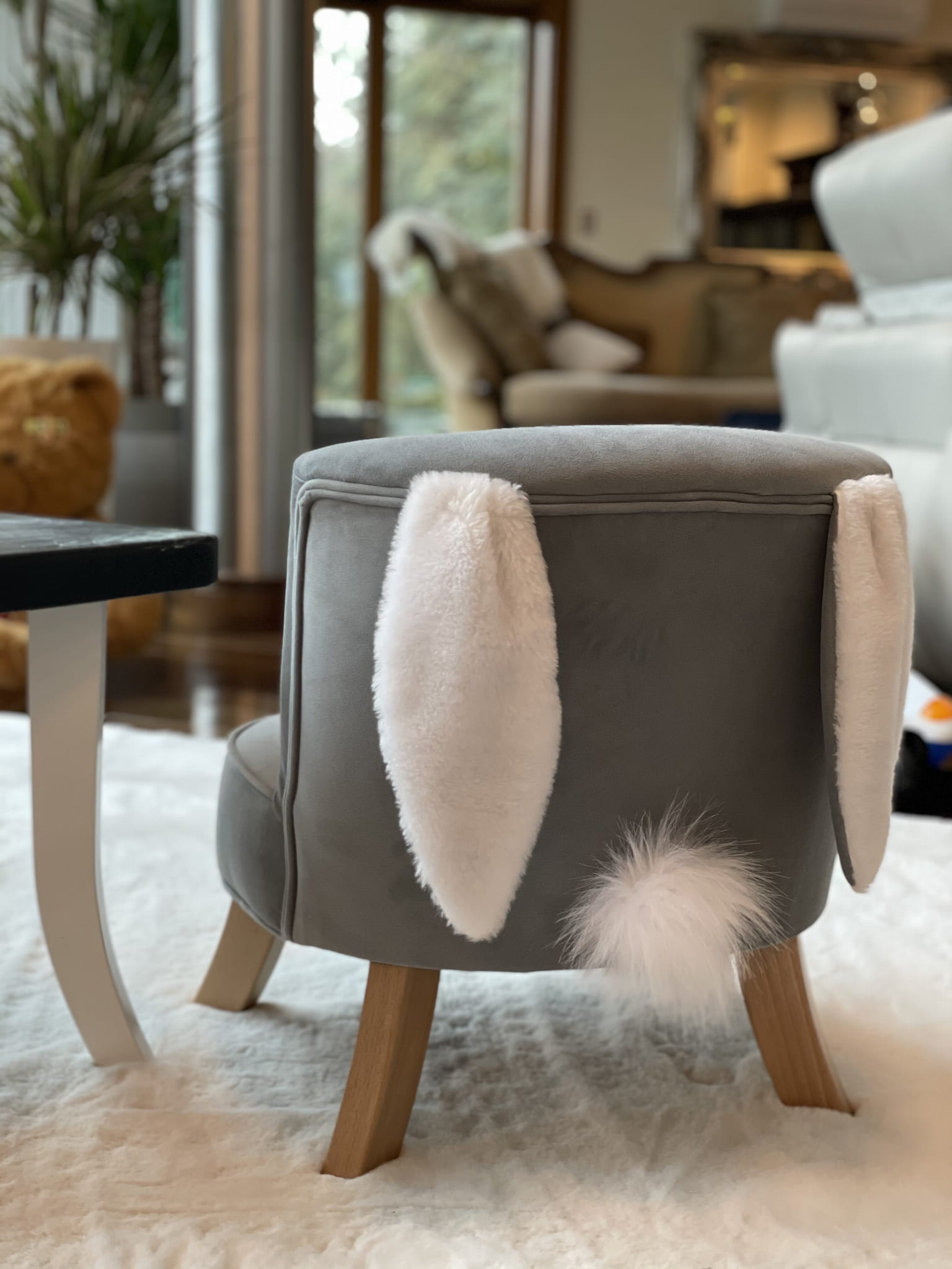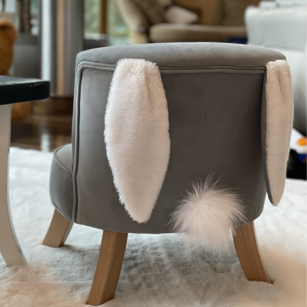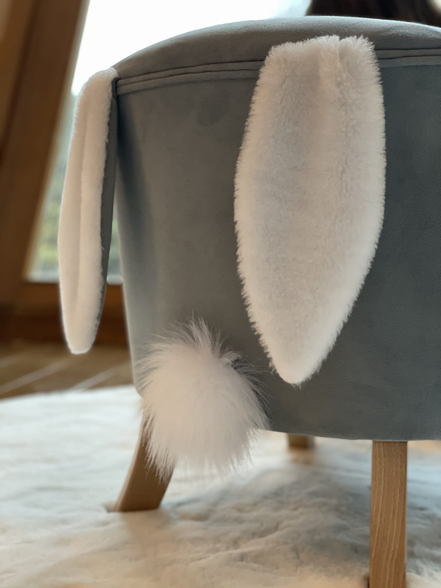 Fotelik posiada wygodne siedzisko i stabilne, drewniane nóżki, które z czasem można wymienić na dłuższe, aby dopasować go do wzrostu dziecka. Dodatkowo, fotelik wyposażony jest w uszka królika i ogonek, które sprawią, że Twoje dziecko poczuje się jak w bajce.